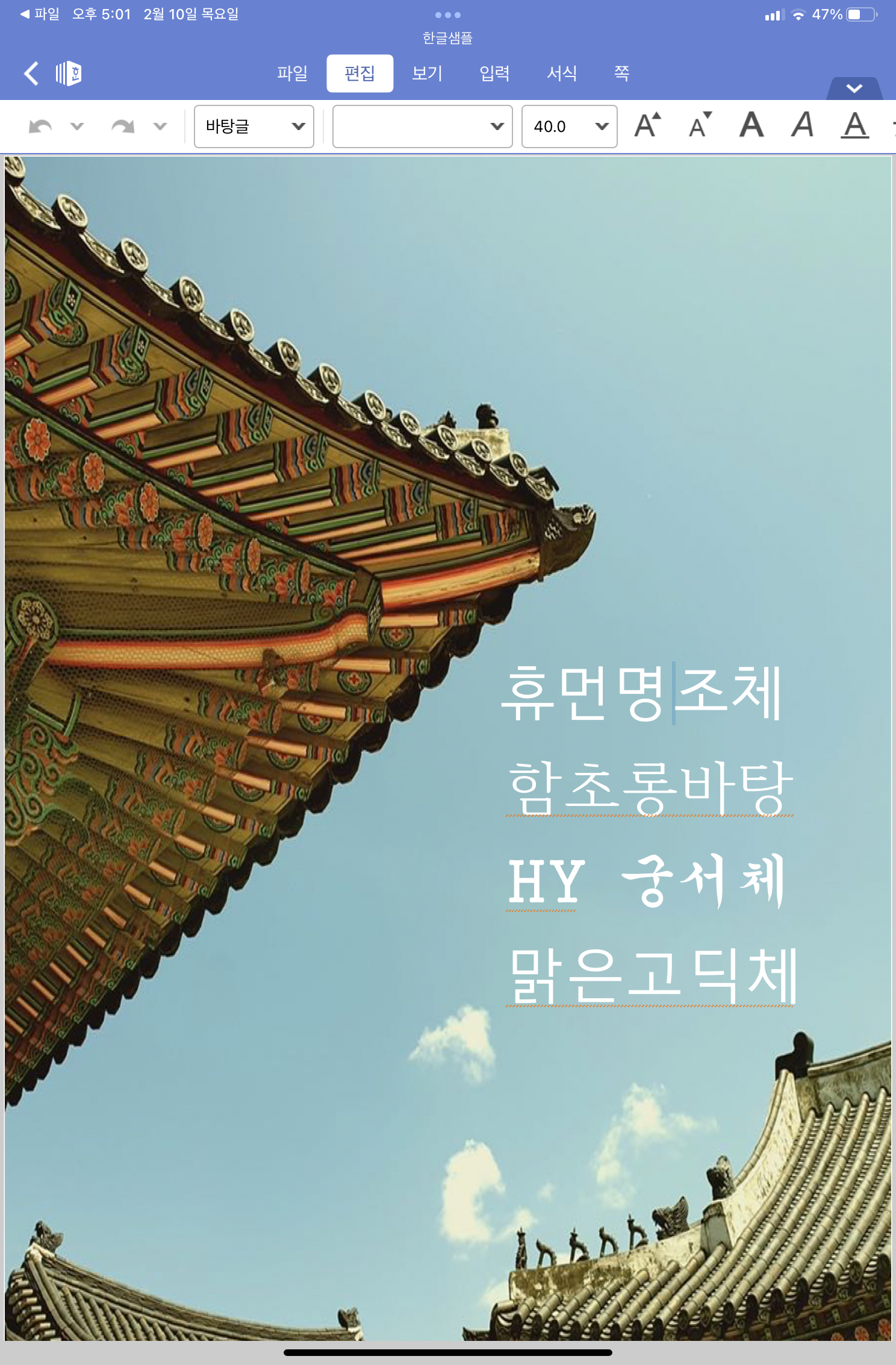 얼마 전 아이패드 미니 6세대를 구입하여 업무에 사용해보려고 바로 한컴오피스 2018 앱을 구매하였으나, 문서에 있는 폰트들이 죄다 함초롱돋움으로 바뀐 것을 보고 실망하여 해결방법이 없나 검색을 해보니 역시 해결책이 있었습니다.