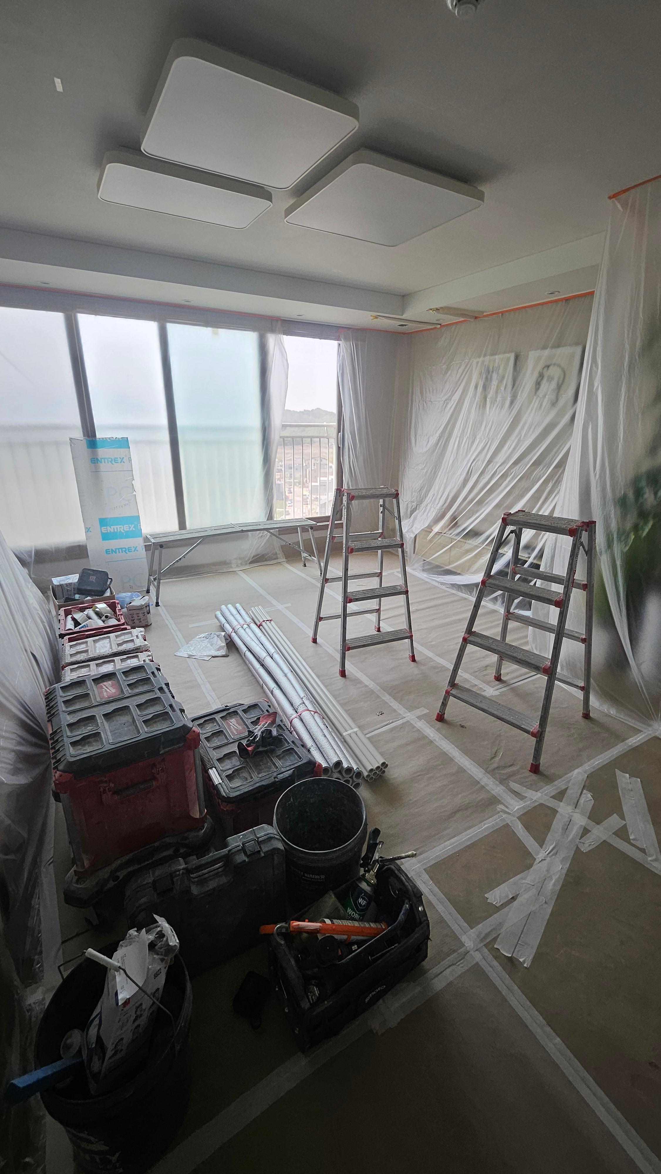 아파트 안에 바닥, 벽, 전부를 비닐과 테이프로 감싸버리는데 이 보양작업만 거의 오전 내내 하는 듯 보였습니다. 처음에는 설치하는 거실과 방만 보양작업을 하는 줄 알았으나, 집안 전체를 작업하더군요.(그래서 더 안심이 갔습니다.)