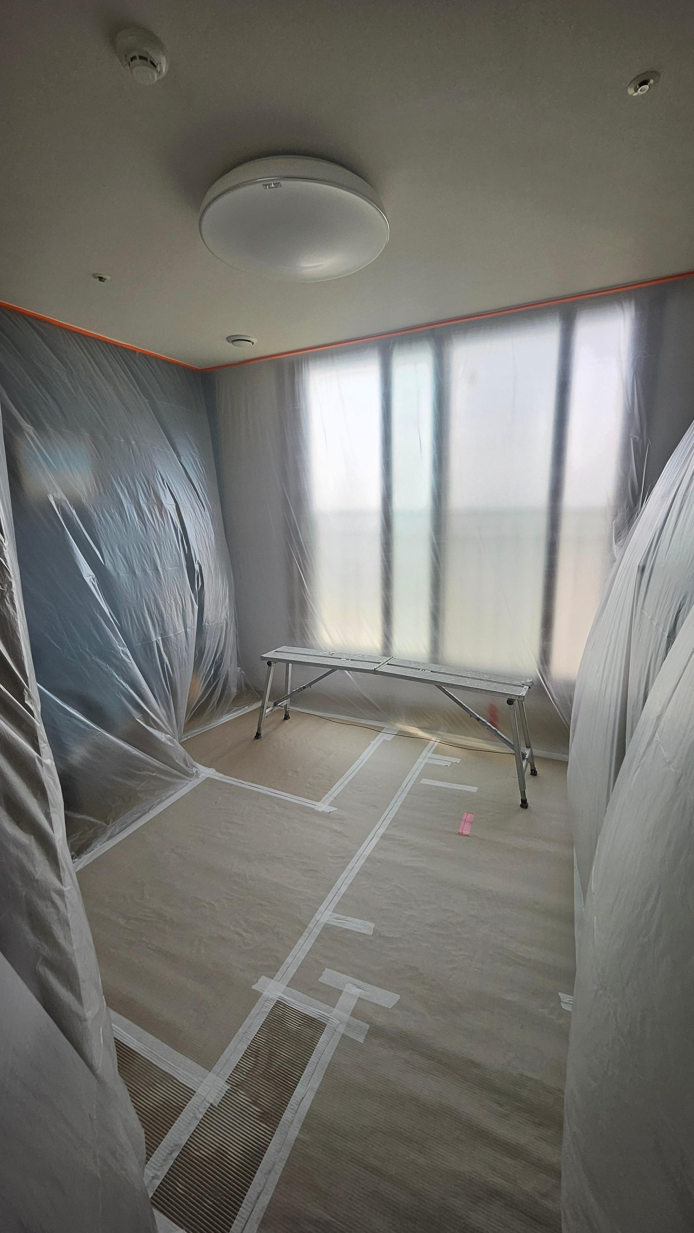 오후 7시에 모든 시공이 끝나서 갔더니 작업 중에 생긴 먼지는 거의 없는 듯했습니다. 오히려 작업이 다 끝나고 환기를 시킨다고 창문을 열어놨는데 그 사이에 송진가루가 많이 들어와 작업먼지보다 더 많이 있었을 만큼 보양작업에 대한 만족도는 높았습니다.